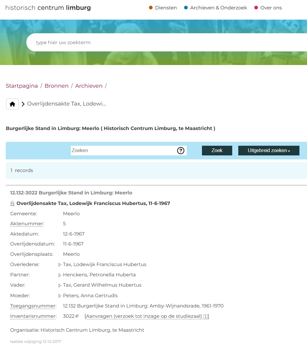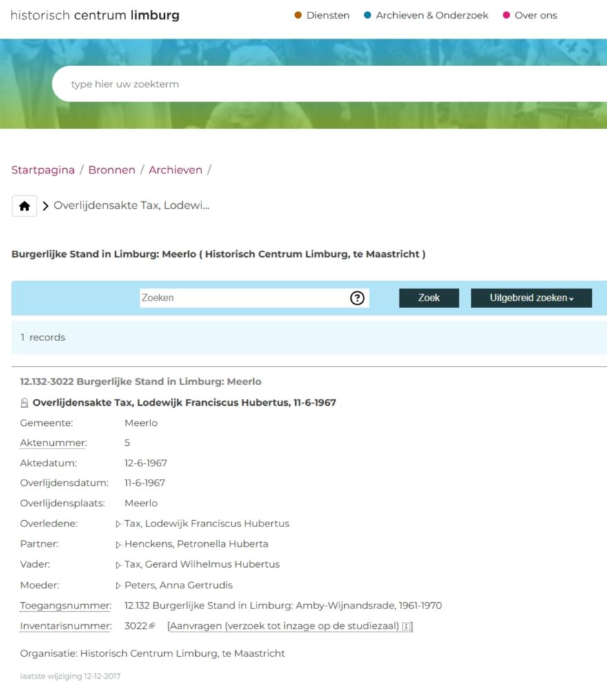 Bron: Overlijden Lodewijk Franciscus Hubertus Tax