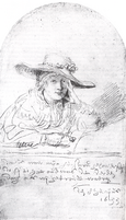begin juni 1633 hadden Rembrandt en Saskia elkaar trouwbeloften gedaan en drie dagen daarna (8 juni 1633) maakte Rembrandt de beroemde tekening met onderschrift van zijn 'echtgenote' met strohoed en bloem in de hand. Ze zouden pas een jaar later officieel trouwen. Na de verloving bleef Saskia tot haar huwelijk in Friesland om in Franeker te zorgen voor het huishouden van haar dodelijk zieke zus Antje (ca. 1598-1633) en haar zwager, de Poolse edelman en hoogleraar theologie Johannes Maccovius (1588-1644).[27] Het kerkelijk huwelijk werd voltrokken in Friesland op 2 juli 1634 in de oude dorpskerk van Sint Annaparochie, op de plek waar nu de Van Harenskerk staat.[28] Na hun huwelijk bleef Rembrandt met Saskia wonen in het huis en werkplaats van Hendrick Uylenburgh in de Breestraat, waar Rembrandt voordien al woonde