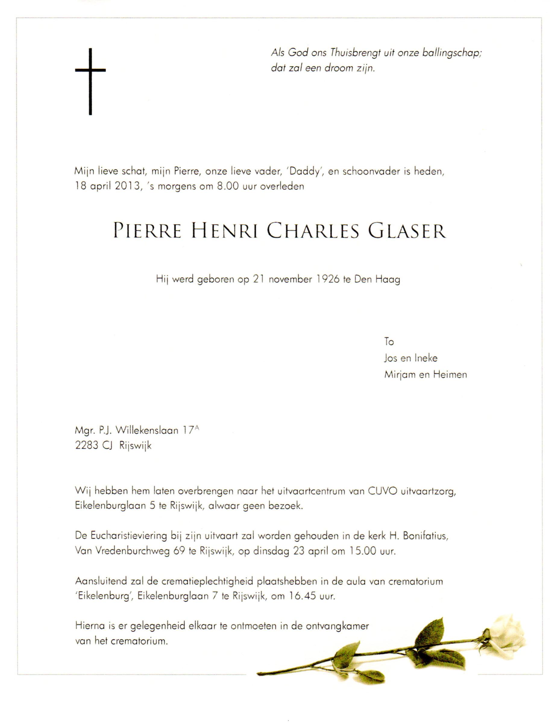 Bron: Rouwkaart Pierre Henri Charles Glaser