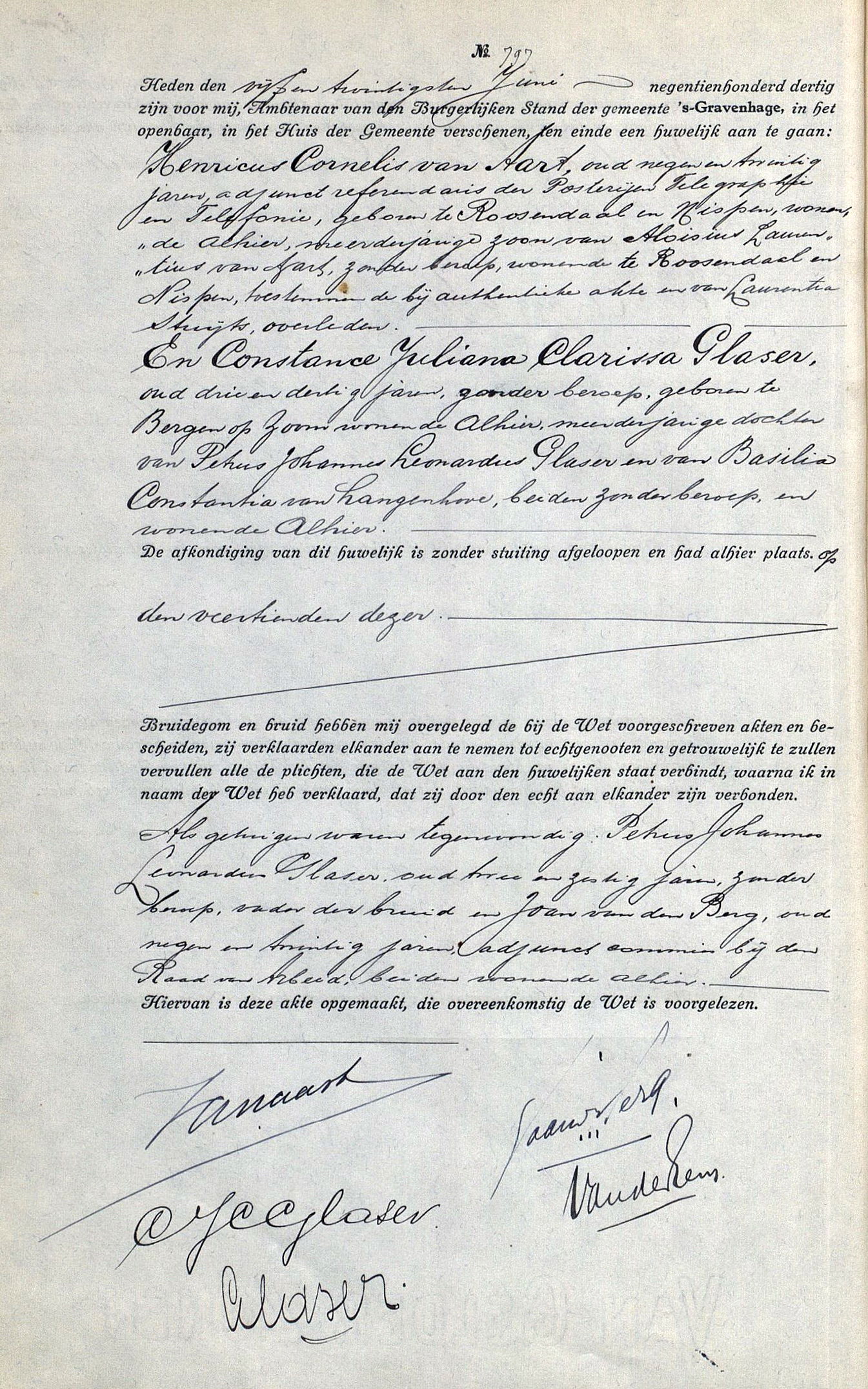 Bron: BS Huwelijksakte Henricus Cornelis van Aart en Constance Juliana Clarissa Glaser
