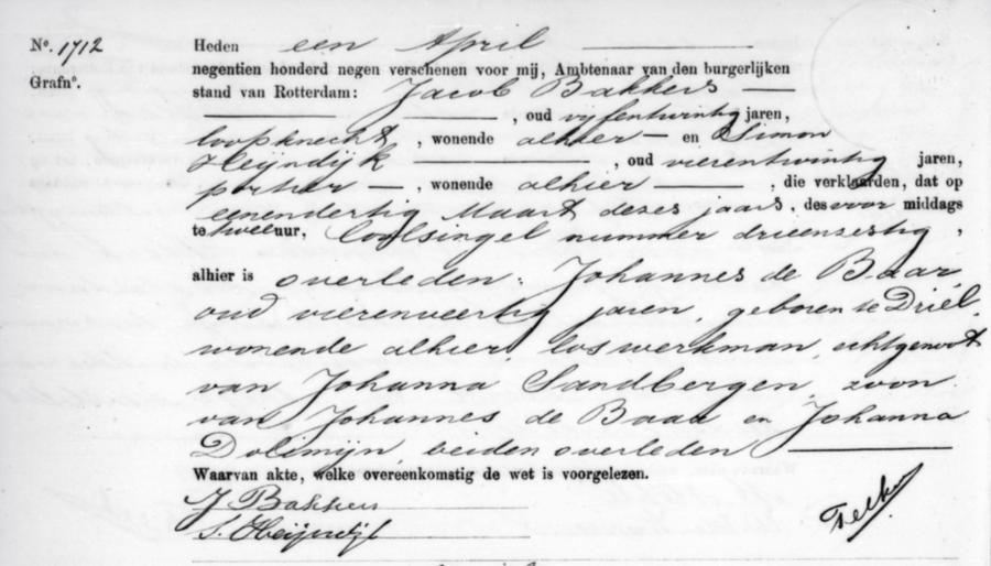 | overledene: | Johannes de Baar Los werkman te Rotterdam[Zh] op 31 maart 1909 | 31 maart 1909 | |
