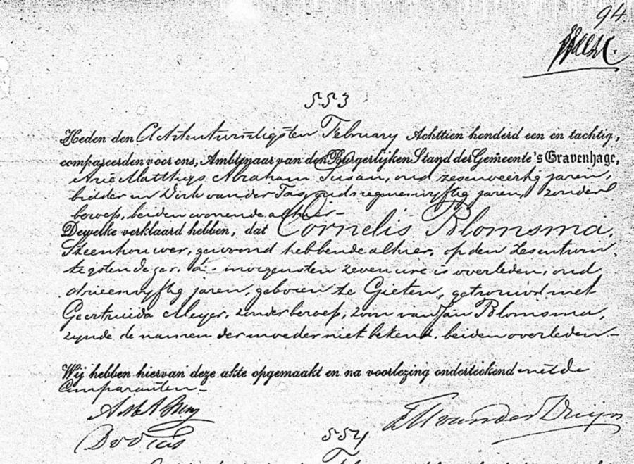 | overledene: | Cornelis Blomsma Steenhouwer te 's-Gravenhage[Zh] op 26 februari 1881 | 26 februari 1881 | |