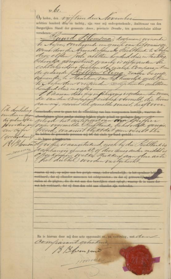 Bron: BS Huwelijk Assen, akte 61,15-11-1883