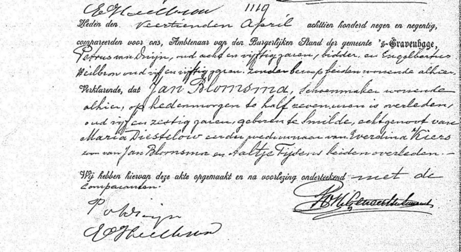 | overledene: | Jan Blomsma Schoenmaker te 's-Gravenhage[Zh] op 14 april 1899 | 14 april 1899 | |