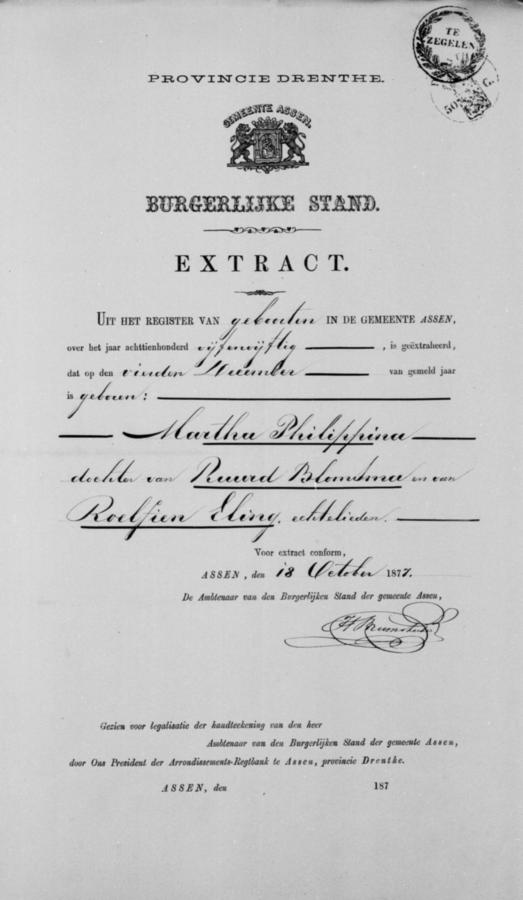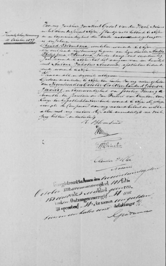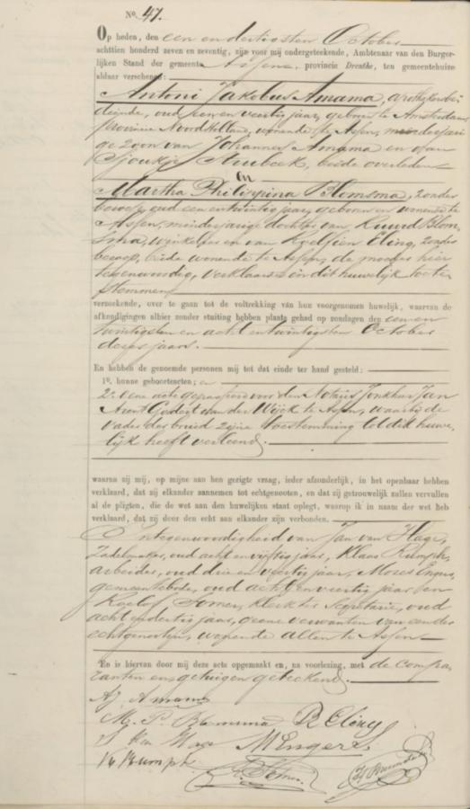 | bruidegom: | Antoni Jakobus Amama Apothekersbediende te Assen[Dr] op 31 oktober 1877 | 31 oktober 1877 | |