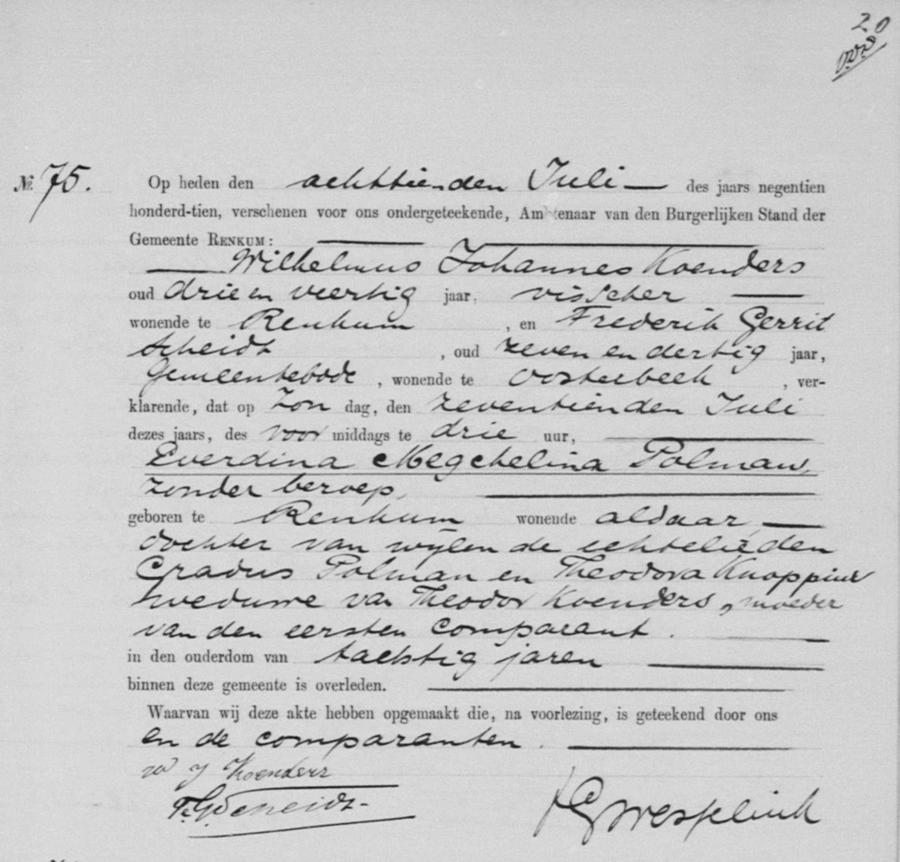 | getuige: | Wilhelmus Johannes Koenders Visscher te Renkum[Ge] op 17 juli 1910 | 17 juli 1910 |