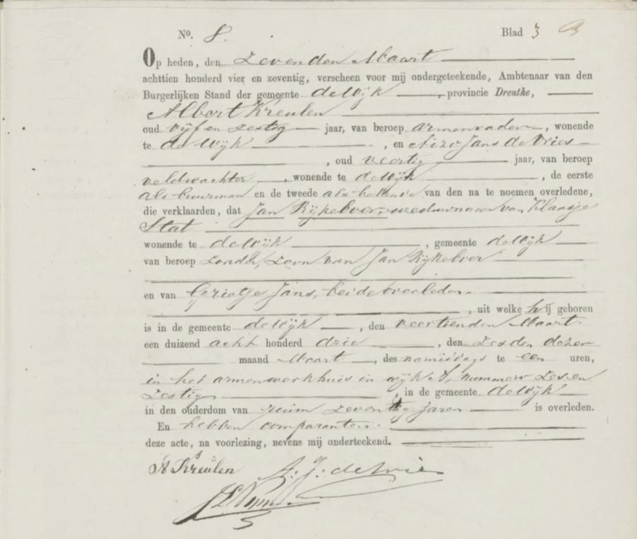 | overledene: | Jan Jans Rijkeboer overleden Armenwerkhuis wijk A nummer 66 te De Wijk op 6 maart 1874 | 6 maart 1874 | |