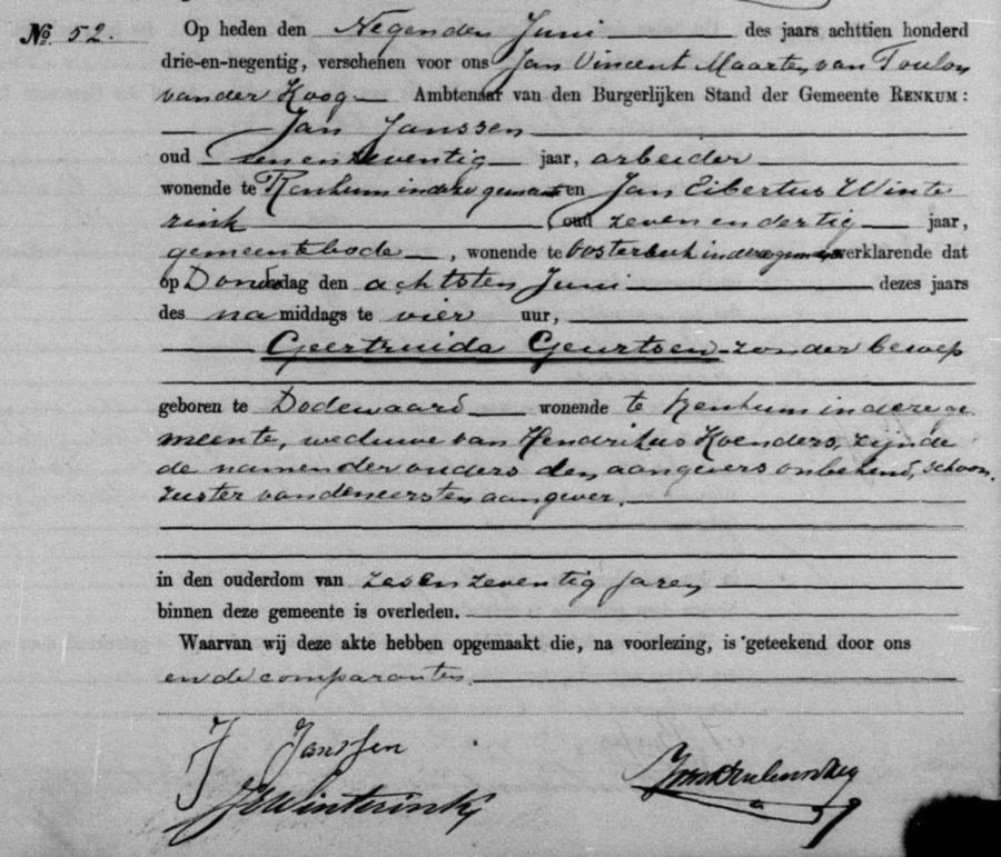 Bron: BS Overlijden Renkum, akte 52, 09-06-1893