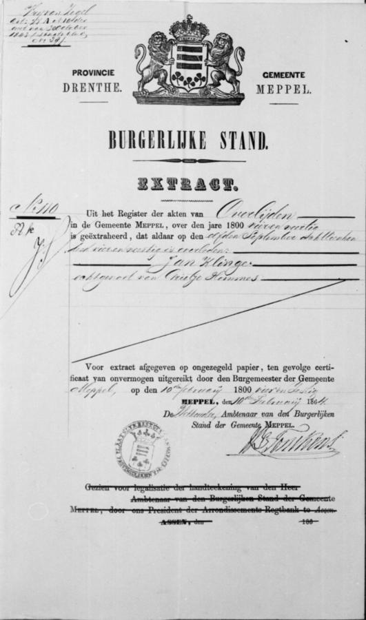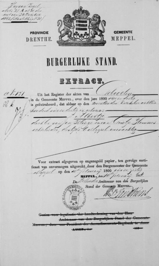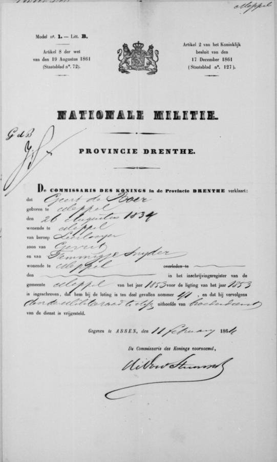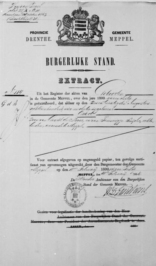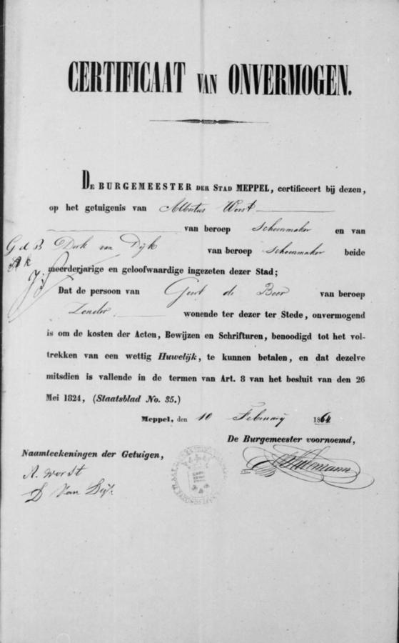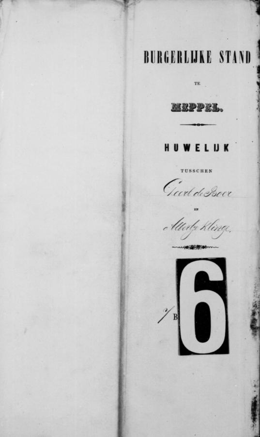 | vader bruidegom: | Gerrit de Boer Wever te Meppel[Dr] op 27 februari 1864 | 27 februari 1864 | |