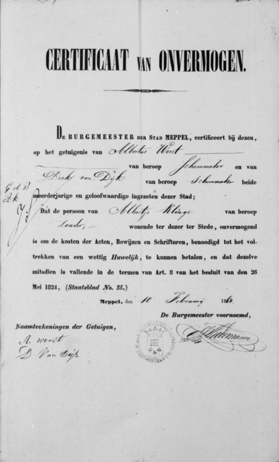 | bruid: | Albertje Klinge | 27 februari 1864 | |