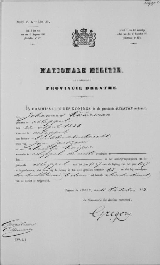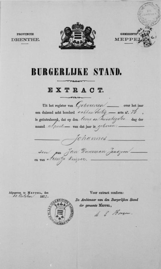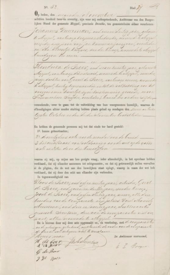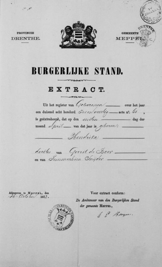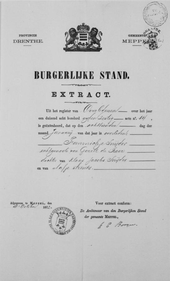 | bruid: | Hendrika de Boer Dienstmeid te Meppel[Dr] op 9 november 1872 | 9 november 1872 | |