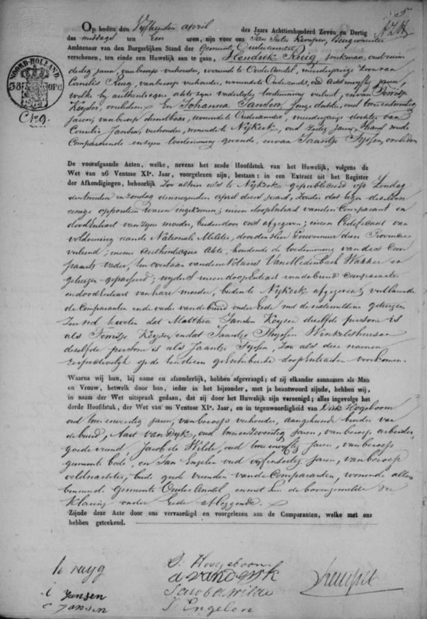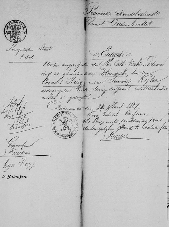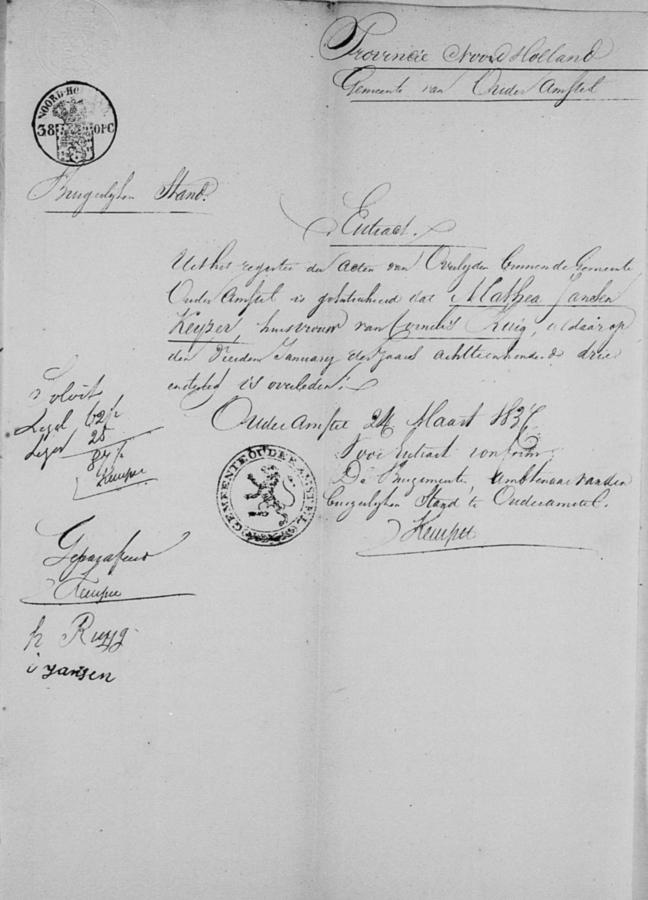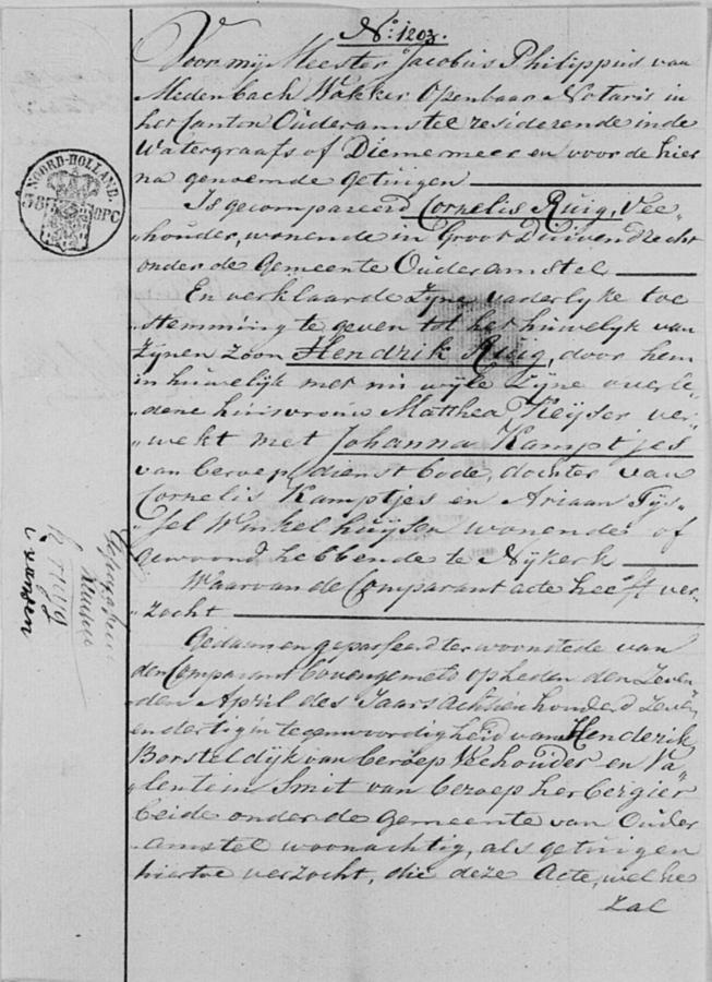 | vader bruidegom: | Cornelis Ruig Veehouder te Ouder-Amstel[Nh] op 15 april 1837 | 15 april 1837 | |