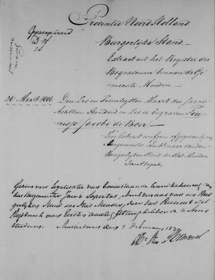 | moeder bruidegom: | Antonia Jacobs de Boer | 20 februari 1830 | geschr. als Antonia de Boer |