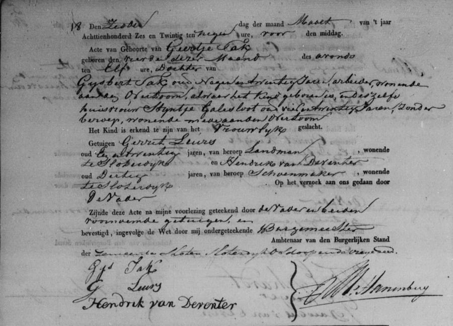 Bron: BS Geboorte Sloten, akte 18, 06-03-1826