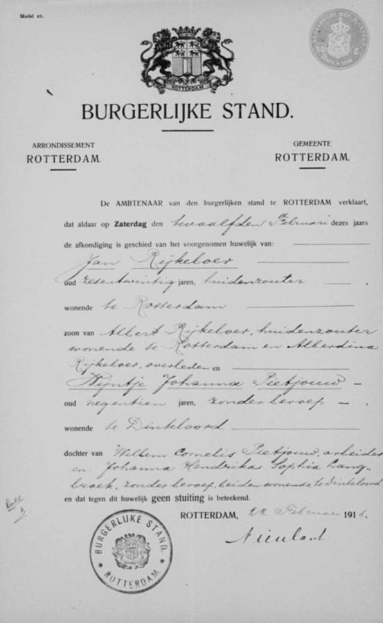 | bruidegom: | Jan Rijkeboer Huidenzouter te Rotterdam[Zh] op 26 februari 1916 | 26 februari 1916 | |