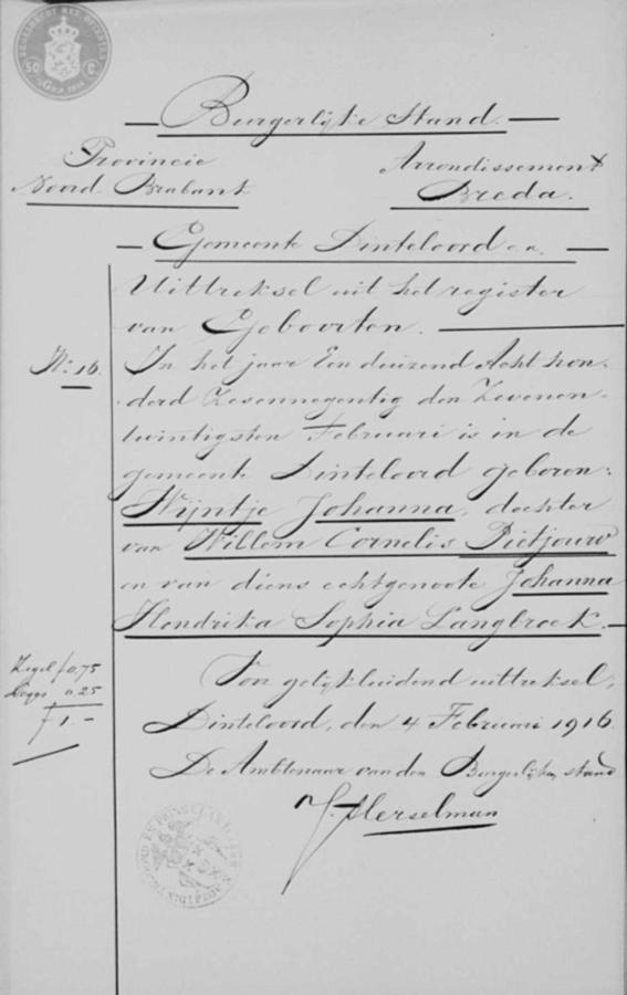 | vader bruid: | Willem Cornelis Pietjouw Arbeider te Dinteloord[Nb] op 26 februari 1916 | 26 februari 1916 | |