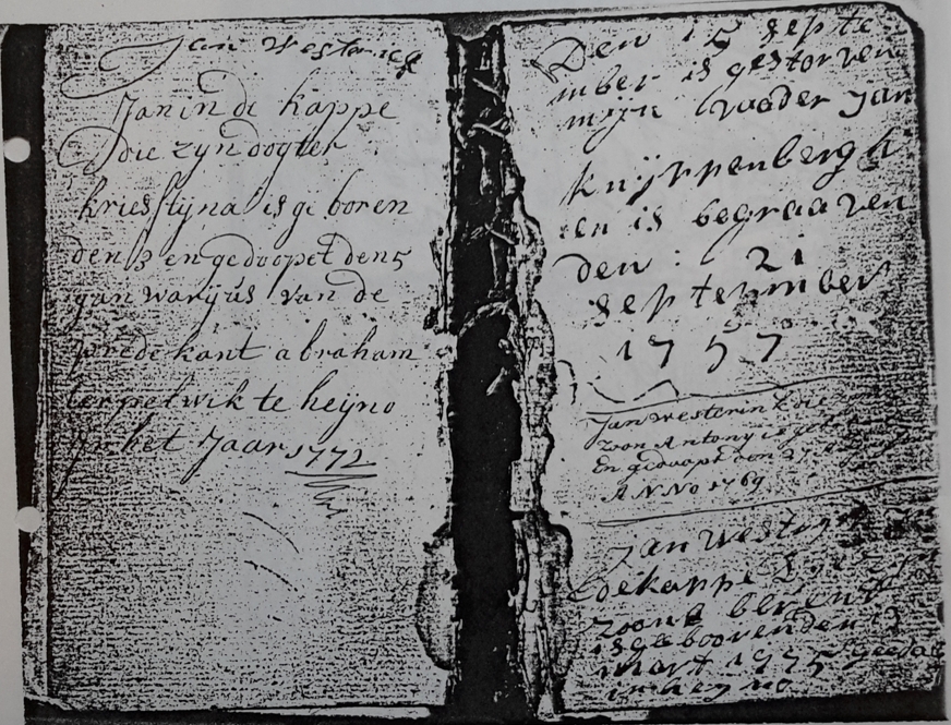 Die zijn dogter Kristijna is geboren den 3 en gedoopt den 5 janwarijus van de predikant Abraham ter Pelwik te Heijno in het jaar 1772