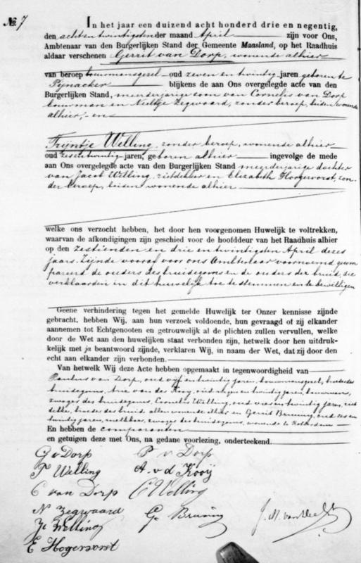 Bron: BS Huwelijk Gerrit van Dorp en Trijntje Welling