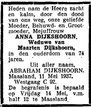 Bron: Rouwadvertentie Anna Dijkshoorn